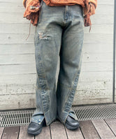 ・サイドの縫い目が前にねじれこんだようなツイストデザインのユニセックスデニム。