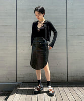 ・ビニールレザーの上品なつや感が目を引くミディ丈スカート。