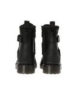 定番の8ホールブーツをベースに、ベルトのディテールでアップデートしたレースアップブーツ。アッパーを包み込むストラップは面ファスナー仕様。ブーツの履き口部分にはメッシュのパッドを施し、快適な履き心地を実現します。アウトソールには分厚いBEXソールを備え足元にボリューム感を演出。ヒールループからウェルトステッチまで全てブラックで統一。モノクロームで仕上げられた洗練された厚底ブーツです。