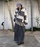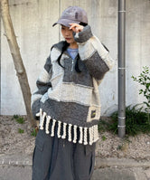 ・大きめの襟元と裾のフリンジが目を引くデザイン。