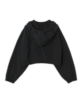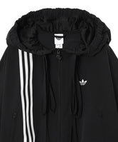 リボンのディテールが施されたオーバーサイズのトラックトップ。フェミニンなドレープ感を演出するオーバーサイズにカットし、大きめのフードにはやや長めのドローコードをあしらい、リボンを大胆に結べるように仕上げている。