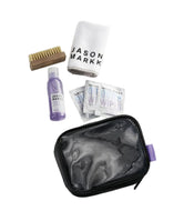 1)2OZ.プレミアムシュークリーナー、プレミアムクリーニングブラシ、マイクロファイバータオル(9in四方=23cm四方)、クイックワイプスのセットです。