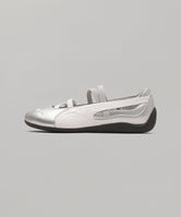 ドライビングシューズにインスパイアされたスピードキャットのスリムな形状はそのままに、バレエの優雅さをプラスしたデザインです。。メタリックアッパー、刺繍されたプーマキャット、モータースポーツのドライビングシューズにインスピレーションを受けたかかとを包むラバーアウトソールが特徴。フィット感を高める伸縮性のあるバンドを甲部分にプラスし、快適な履き心地を提供します。 すっきりとしたシルエットでパンツスタイルにもスカートスタイルにも合わせやすいシューズです。このアイコニックなプーマのシルエットで、ロープロファイルトレンドを取り入れたコーディネートを完成させよう。