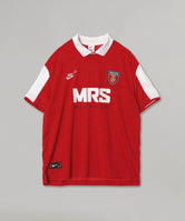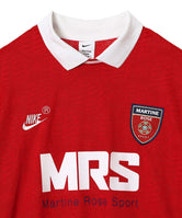 Nikeのアイコニックな90年代のサッカーユニフォームのトップスをMartine Roseがアレンジ。Martine RoseのSwooshの円形柄をジャガード地で全面にあしらい、ラグランスリーブと正統派のジョックタグを備えたデザインだ。フロントとバックに施した、Martine RoseのエンブレムとMartine Rose・Sportsのグラフィックが、仕上がりをさらに引き立てる。どんなゲームであれ、このユニフォームを羽織れば、競争心に火がつくだろう。